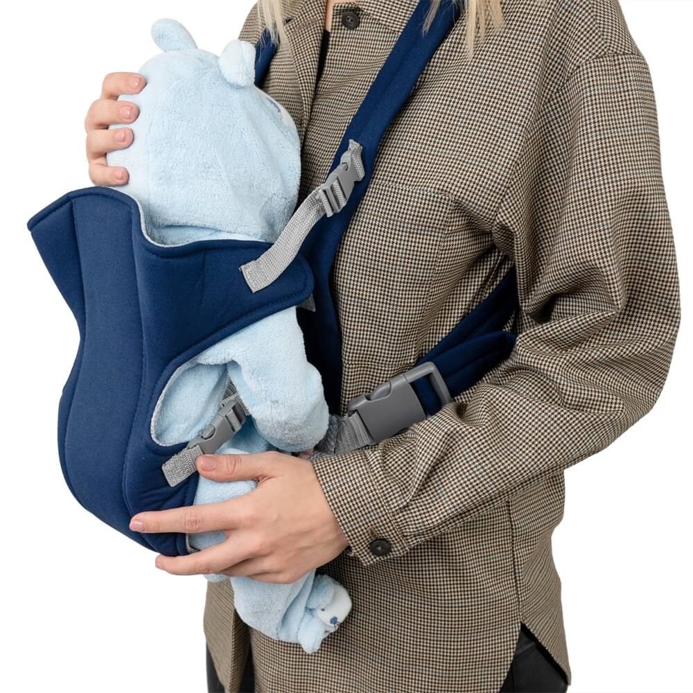 Рюкзак кенгуру из мягкого материала синего цвета со специальными вставками, пропускающими воздух. Широкие удобные лямки и пояс правильно распределяют вес ребенка по телу и не вызывают усталости и дискомфорта. Эргономичный крой рюкзака поддерживает ребенка в правильном положении. Регулировка позволяет менять ширину сидения в зависимости от возраста ребенка. Плечевые ремни и пояс регулируются.